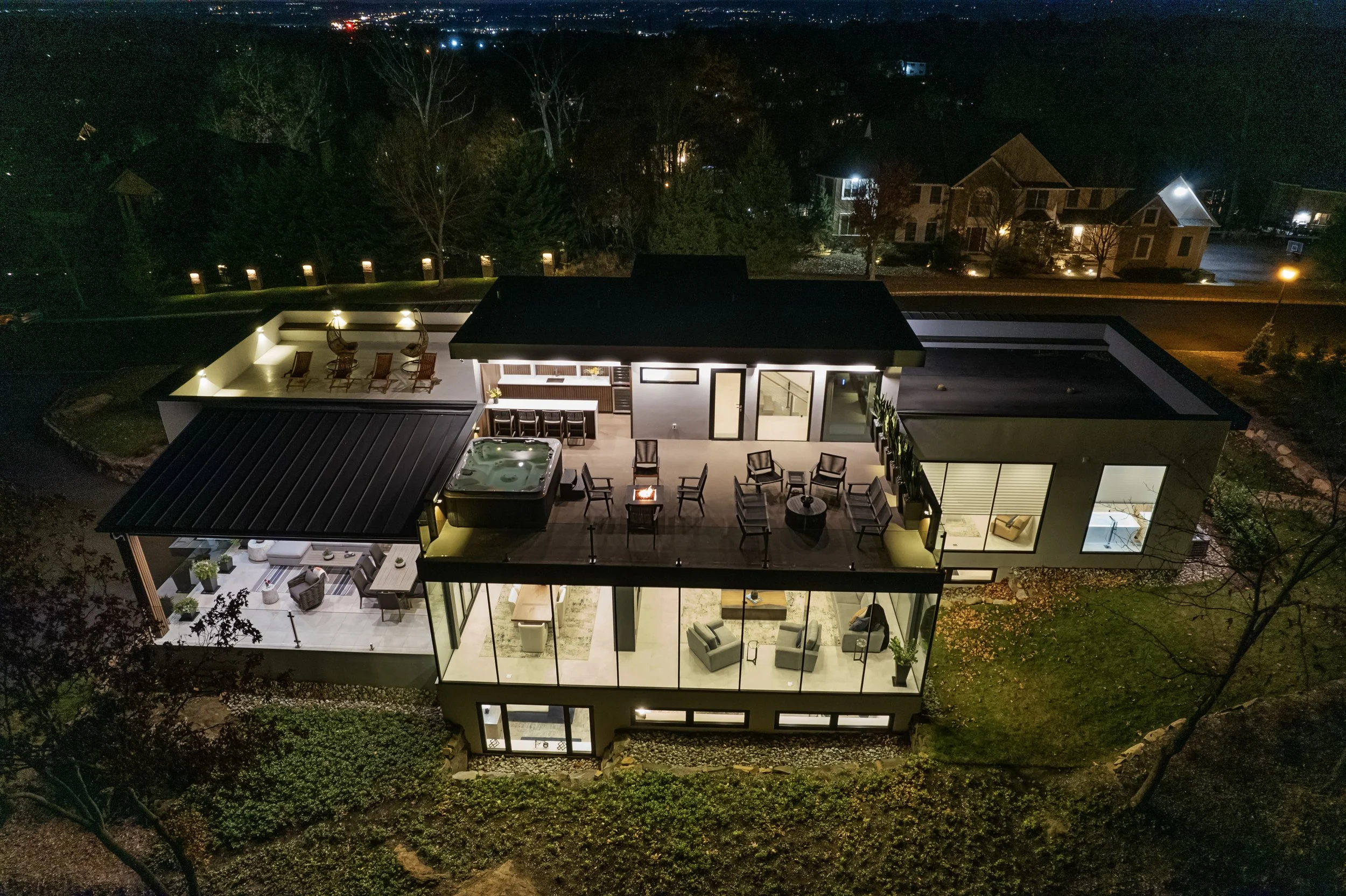 The home is offered fully furnished and turnkey, appointed with all-new, top-tier furnishings and finishes. Floor-to-ceiling glass on three sides of the main living and dining areas frames unobstructed panoramic skyline views. A rooftop sky deck with spa, fire pit, and bar, a private elevator with skyline views, professional home theater, gym, wine cellar, and multiple entertaining spaces support executive living and discreet hosting at the highest level.